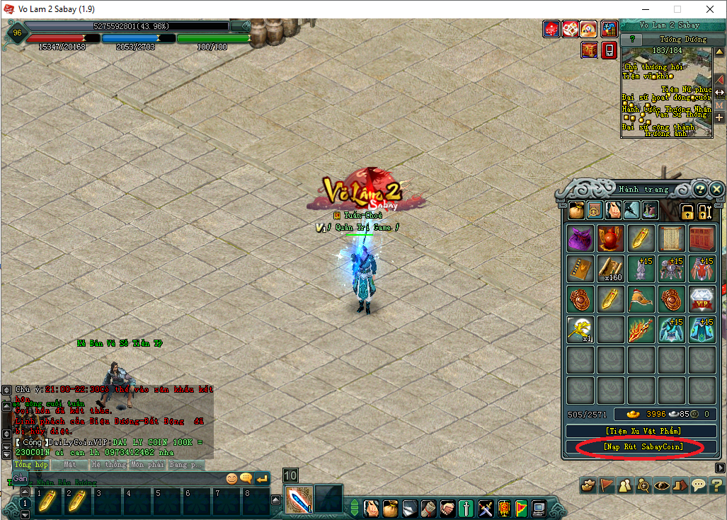 Bước 1: Đăng nhập vào game Võ lâm 2 Sabay và Mở túi (F4) nhấn vào dòng "Nạp Rút SabayCoin"